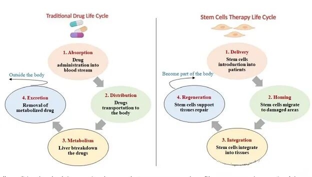 不同于传统药物 “吸收 - 分布 - 代谢 - 排泄” 的单次作用模式,活细胞进入体内后,可主动归巢至病灶处、融入宿主组织,并长期发挥修复功效。